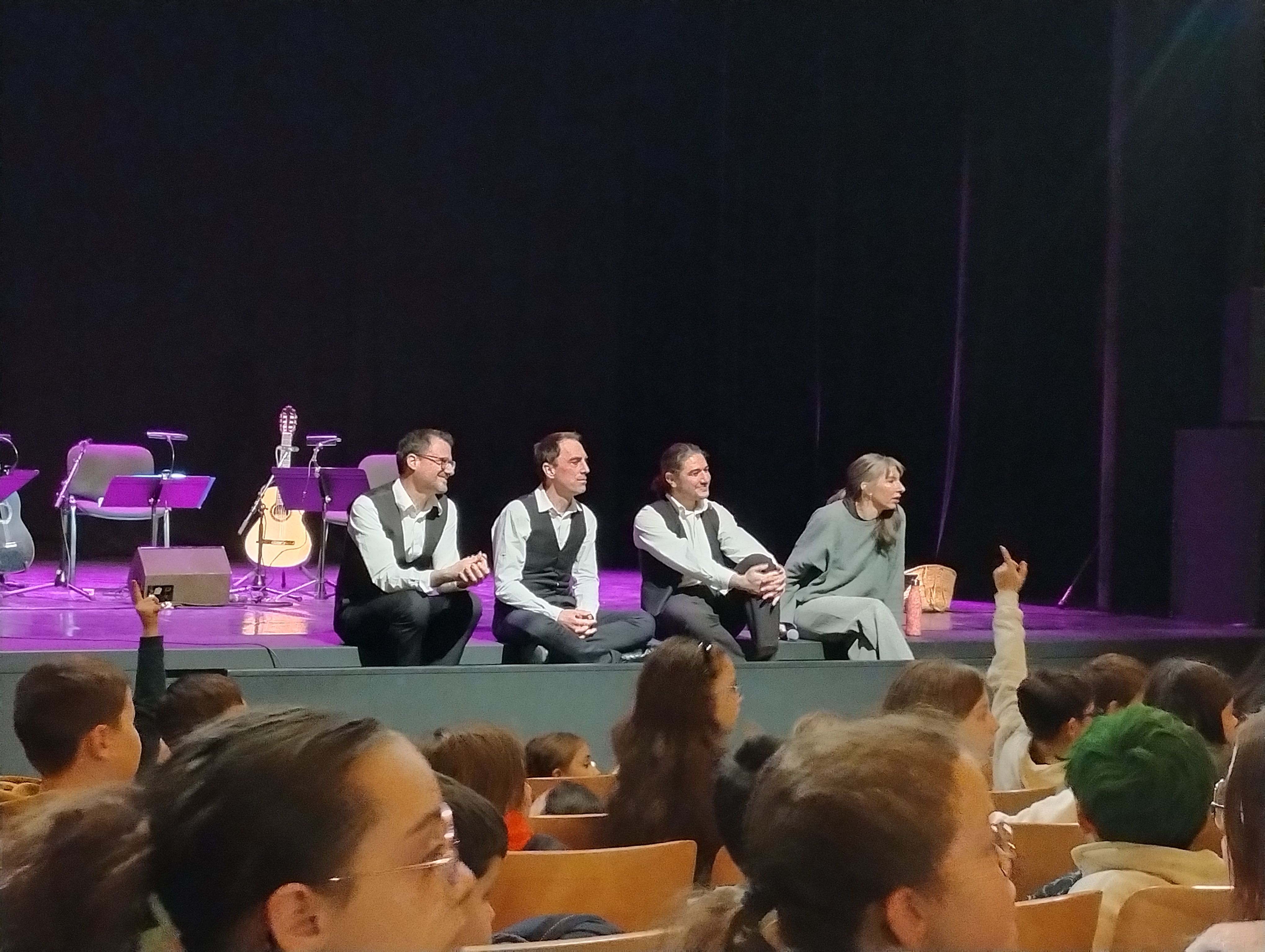 Lundi 17 mars, les élèves de CM1-CM2 ont rejoint d’autres classes du même niveau pour assister à un spectacle musicale au Théâtre Millandy à Luçon. Il s’agit d’une adaptation de Carmen, une nouvelle écrite en 1845 de Prosper Mérimée réadaptée en musique et histoire contée et dansée par la troupe Trio La Palmera (guitaristes) et Géraldine Gahon (danseuse et conteuse). Nous avons découvert cette histoire au son des guitares classiques espagnoles et en admirant de la danse contemporaine.