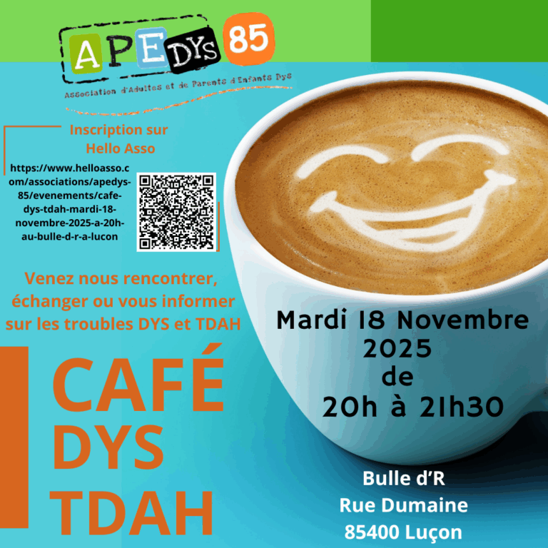 APEDYS 85 propose un Café-Dys/TDAH qui se déroulera le Mardi 18 novembre 2025 de 20h à 21h à Luçon, à Bulle d’R, rue Dumaine, 85400 Luçon.
