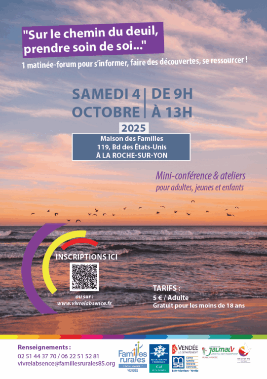 Dans notre société, le deuil n’est pas un sujet facile à aborder, même si nous avons été, nous sommes, nous serons chacun(e) confrontés un jour à la perte d’un proche. Afin d’apporter ressourcement et réconfort aux ENFANTS, JEUNES, ADULTES qui traversent cette épreuve, associations et acteurs institutionnels se réunissent pour organiser une matinée qui aura lieu le samedi 4 octobre à La Roche-sur-Yon : « Sur le chemin du deuil, prendre soin de soi… ».