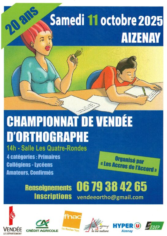Le championnat de Vendée d’orthographe  aura lieu le samedi 11 octobre prochain à Aizenay, salle des Quatre-Rondes, route de Challans.