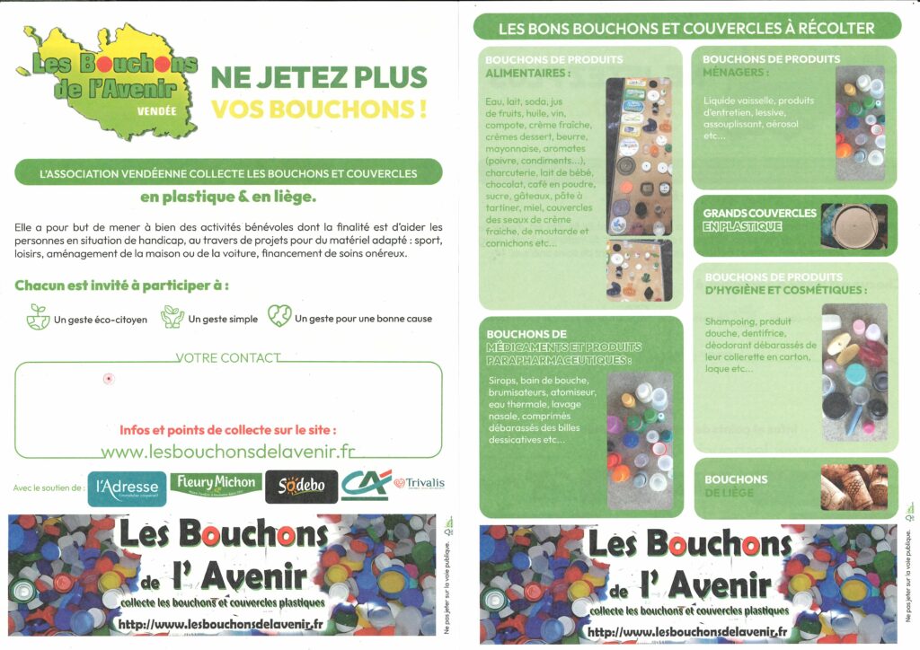 L’association Les Bouchons de l’Avenir collecte les bouchons et couvercles en plastique et en liège. La finalité est d’aider les personnes en situation de handicap, au travers de projets pour du matériel adapté : sport, loisirs, aménagement, financement de soins.
