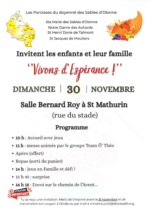 Proposition du doyenné des Sables d’Olonne pour les CE-CM et leur famille : “Vivons l’Espérance !” le dimanche 30 novembre :