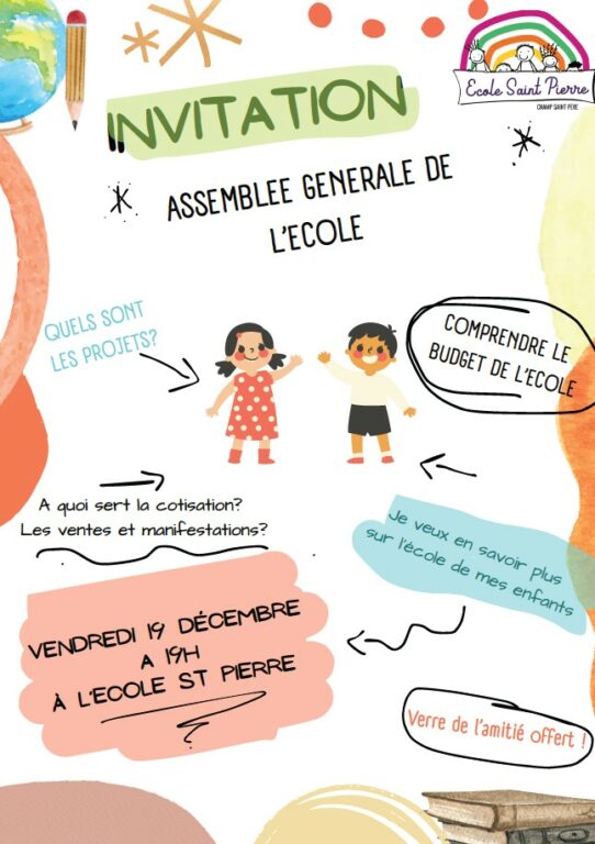 Vous êtes invités à venir assister à l’assemblée générale de l’OGEC et de l’APEL qui se déroulera le VENDREDI 19 DECEMBRE à 19h à l’école.