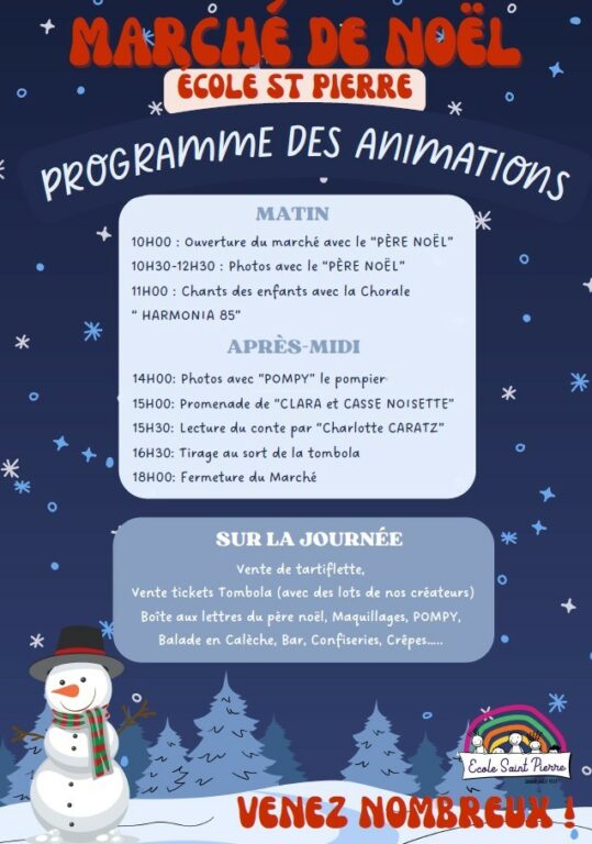 Les élèves sont tous conviés à venir participer au marché de Noël qui se déroulera à l’école le samedi 6 décembre. Il est prévu que les enfants y interprètent un chant à 11h00 avec la Chorale Harmonia 85.