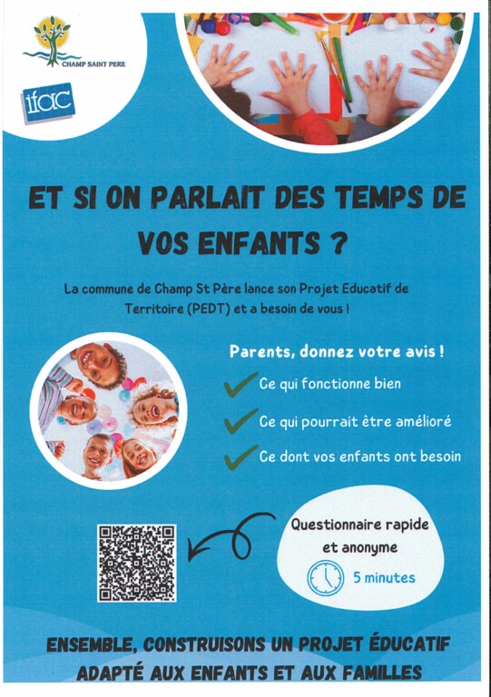 Dans le cadre du lancement du Projet Éducatif Territorial (PEDT), la municipalité de Champ Saint Père souhaite recueillir votre avis ainsi que celui de vos enfants sur les temps périscolaires.